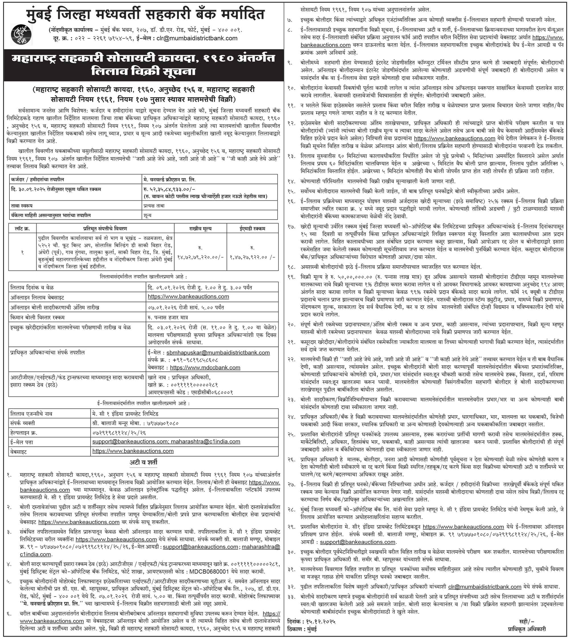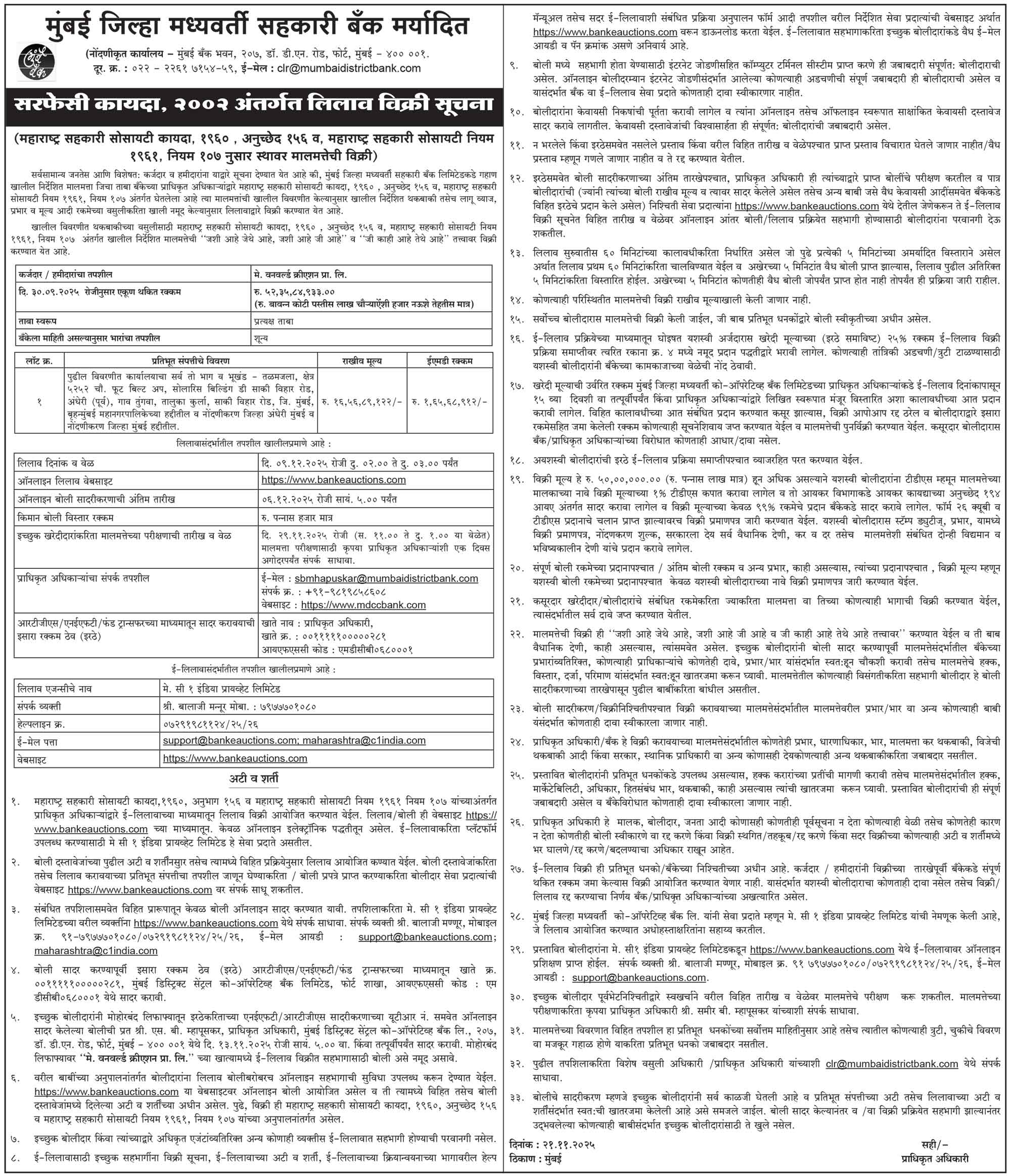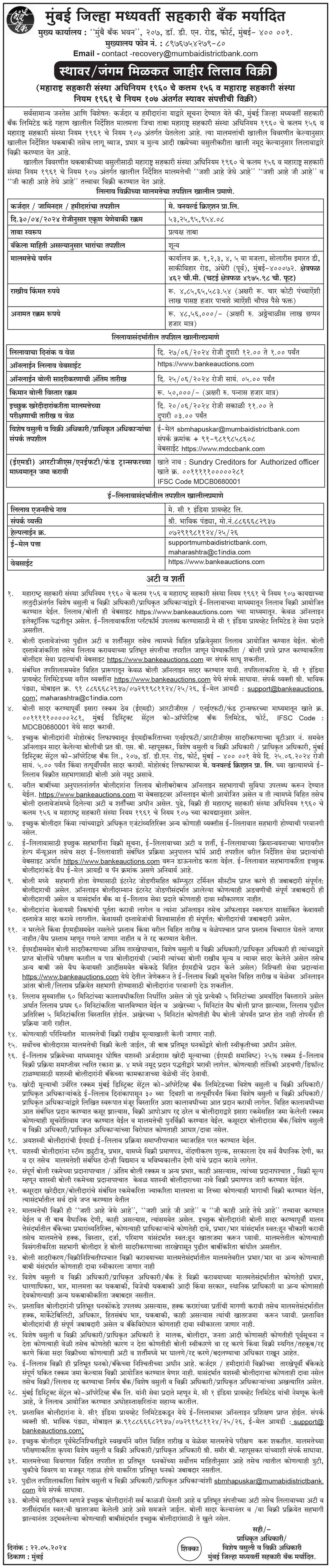 मेसर्स वनवर्ल्ड क्रिएशन प्रायव्हेट लिमिटेडची ई-लिलाव विक्री सूचना मराठी मध्ये. |