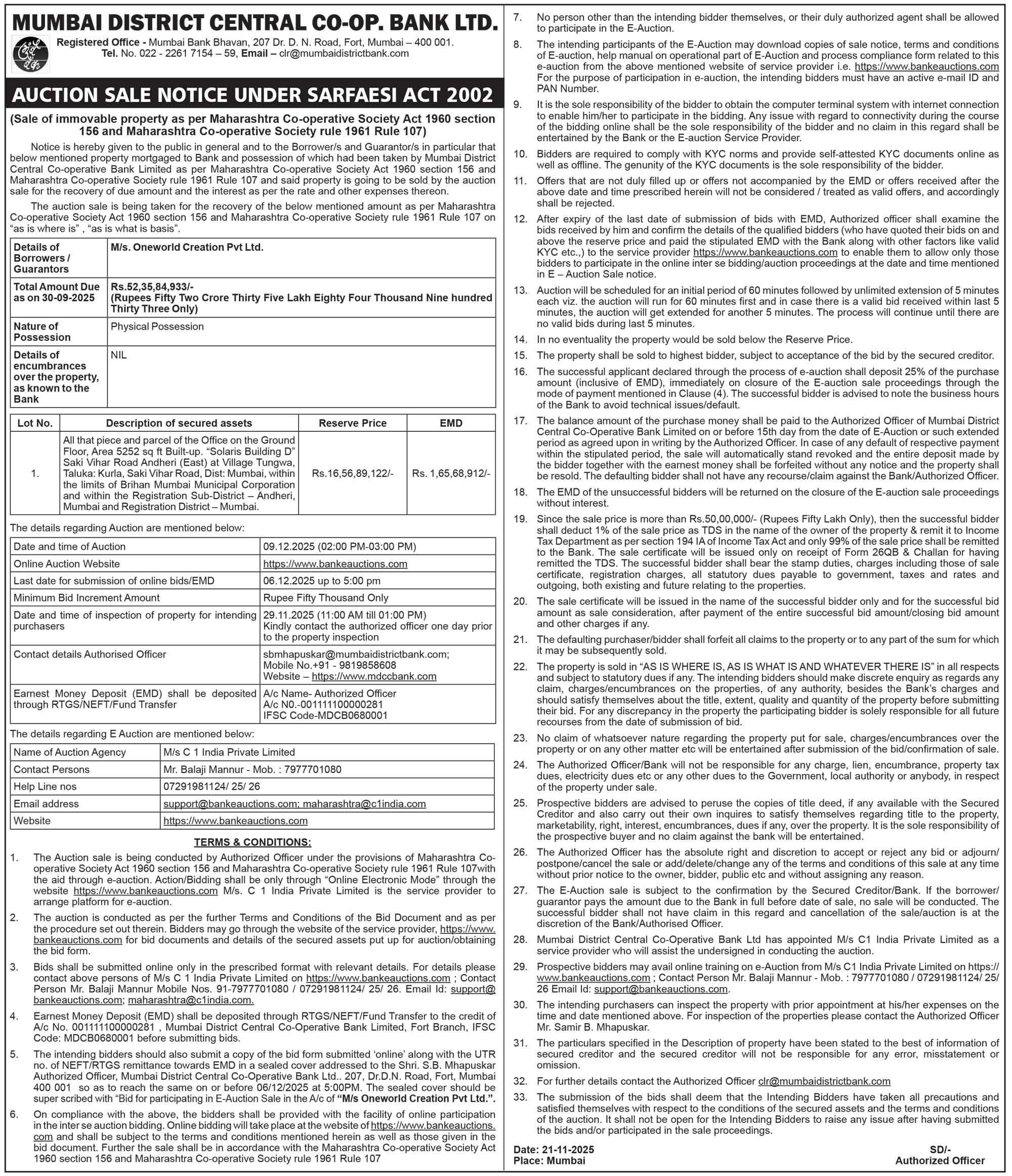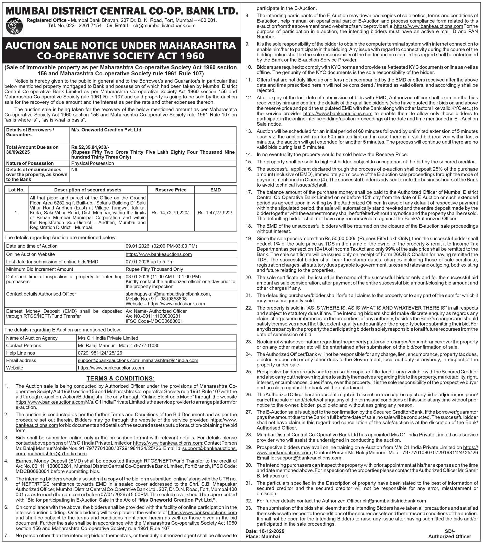 मेसर्स वनवर्ल्ड क्रिएशन प्रायव्हेट लिमिटेडची ई-लिलाव विक्री सूचना इंग्रजी मध्ये. |