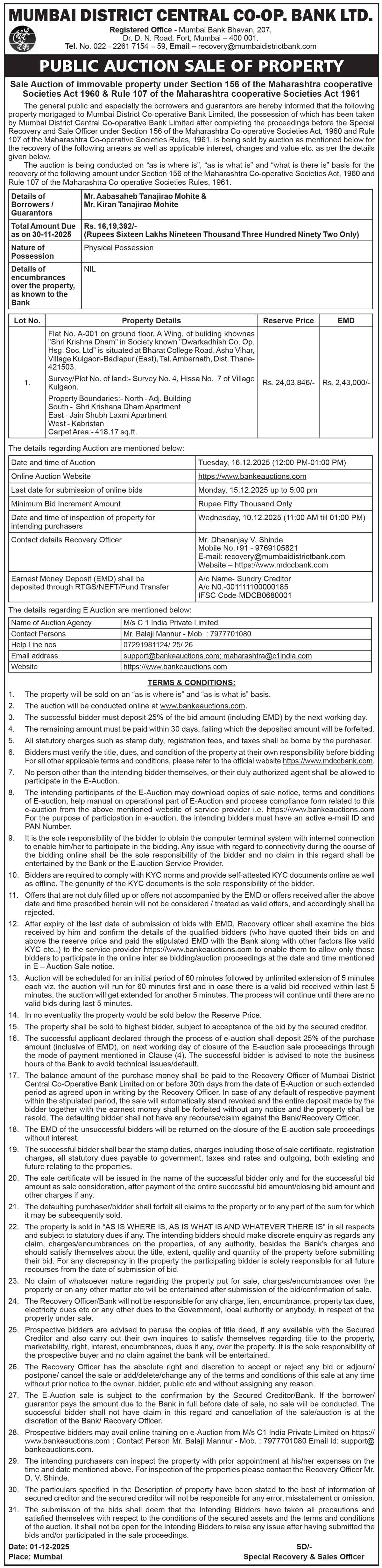 श्री. मनोज नरोत्तमदास ढाका ची ई लिलाव विक्री सूचना इंग्रजी मध्ये. |