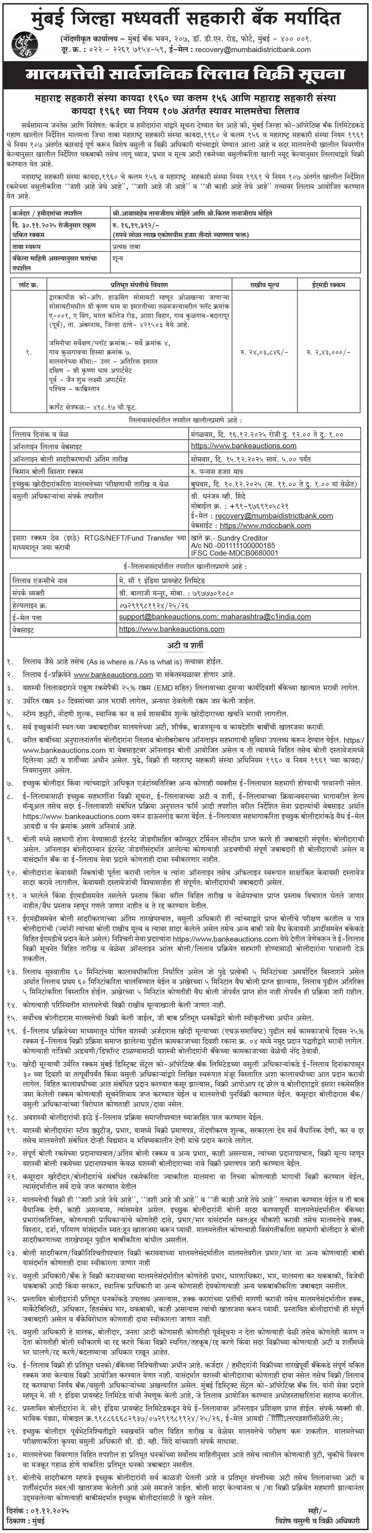 श्री. मनोज नरोत्तमदास ढाका ची ई लिलाव विक्री सूचना मराठी मध्ये. |